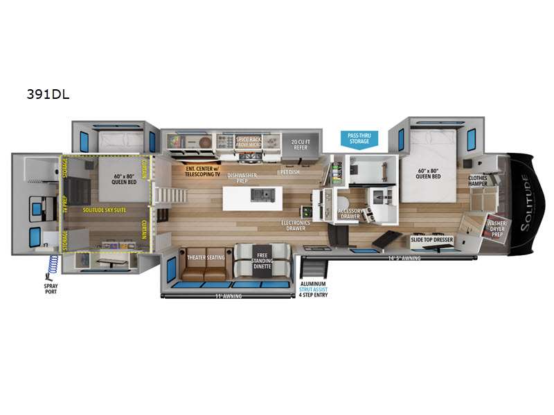 Grand Design Solitude fifth wheel 391DL highlights: Two Full Bathrooms Dual ... more about Solitude 391DL