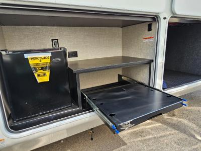 You can work from anywhere with this fifth wheel thanks to the middle bonus room that offers a desk with TV above, a tri-fold sofa with removable table, a flip-up bunk and a closet. This multi-use room works for just about anything including an extra living area and bunkhouse. The shoe storage under the interior steps, the linen cabinet in the full bathroom, the walk-in closet in the bedroom, and the overhead cabinets plus exterior storage allows you to bring whatever you want. Enjoy cooking in the kitchen that provides an island with a flip-up butcher block, a residential refrigerator, a pantry, and everything you need to keep everyone fed. The theater seats, the tri-fold sofa and the free standing table without a pedestal are great places to sit while watching the 50" Smart LED HDTV with fully digital HDMI output and home entertainment system with subwoofer, plus there is a fireplace below for those chilly evenings.