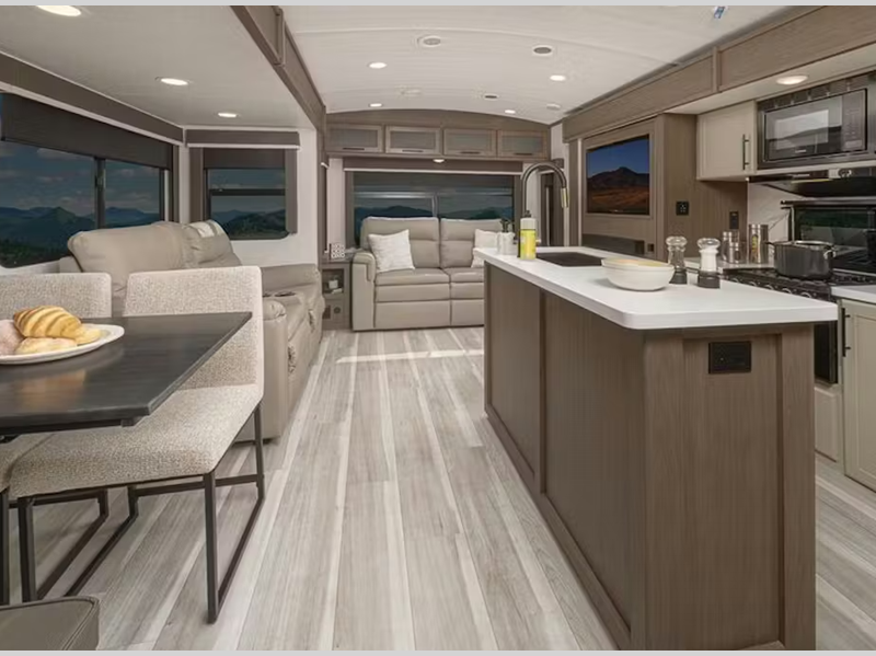 Sleeps 9 Slides 1 Length 34 ft 5 in Ext Height 11 ft 5 in Interior Color Driftwood Hitch Weight 680 lbs Dry Weight 7040 lbs Cargo Capacity 2440 lbs Fresh Water Capacity 54 gals Grey Water Capacity 76 gals Black Water Capacity 38 gals Tire Size ST225/75R15E Furnace BTU 30000 btu Number Of Bunks 2 Available Beds King Refrigerator Type 12V Refrigerator Size 10.4 cu ft Cooktop Burners 3 Number of Awnings 1 LP Tank Capacity 30 lbs Water Heater Type Girard Tankless On Demand AC BTU 15000 btu TV Info LR LED HDTV Awning Info 19' Electric w/Gas Strut Arm w/Dotless Neon Lighting Axle Count 2 Number of LP Tanks 2 Shower Type Radius Electrical Service 50 amp Similar Floorplans