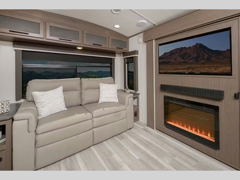 Sleeps 4 Slides 2 Length 33 ft 7 in Ext Height 11 ft 5 in Hitch Weight 960 lbs Dry Weight 7704 lbs Cargo Capacity 1796 lbs Fresh Water Capacity 54 gals Grey Water Capacity 76 gals Black Water Capacity 38 gals Tire Size ST225/75R15E Furnace BTU 30000 btu Available Beds King Refrigerator Type 12V Refrigerator Size 10.4 cu ft Cooktop Burners 3 Shower Size 36" x 30" Number of Awnings 2 LP Tank Capacity 30 lbs Water Heater Type Tankless On Demand AC BTU 15000 btu TV Info LR LED HDTV Awning Info 10' Electric w/Gas Strut Arm w/Dotless Neon Lighting Axle Count 2 Number of LP Tanks 2 Shower Type Standard Electrical Service 50 amp Similar Floorplans